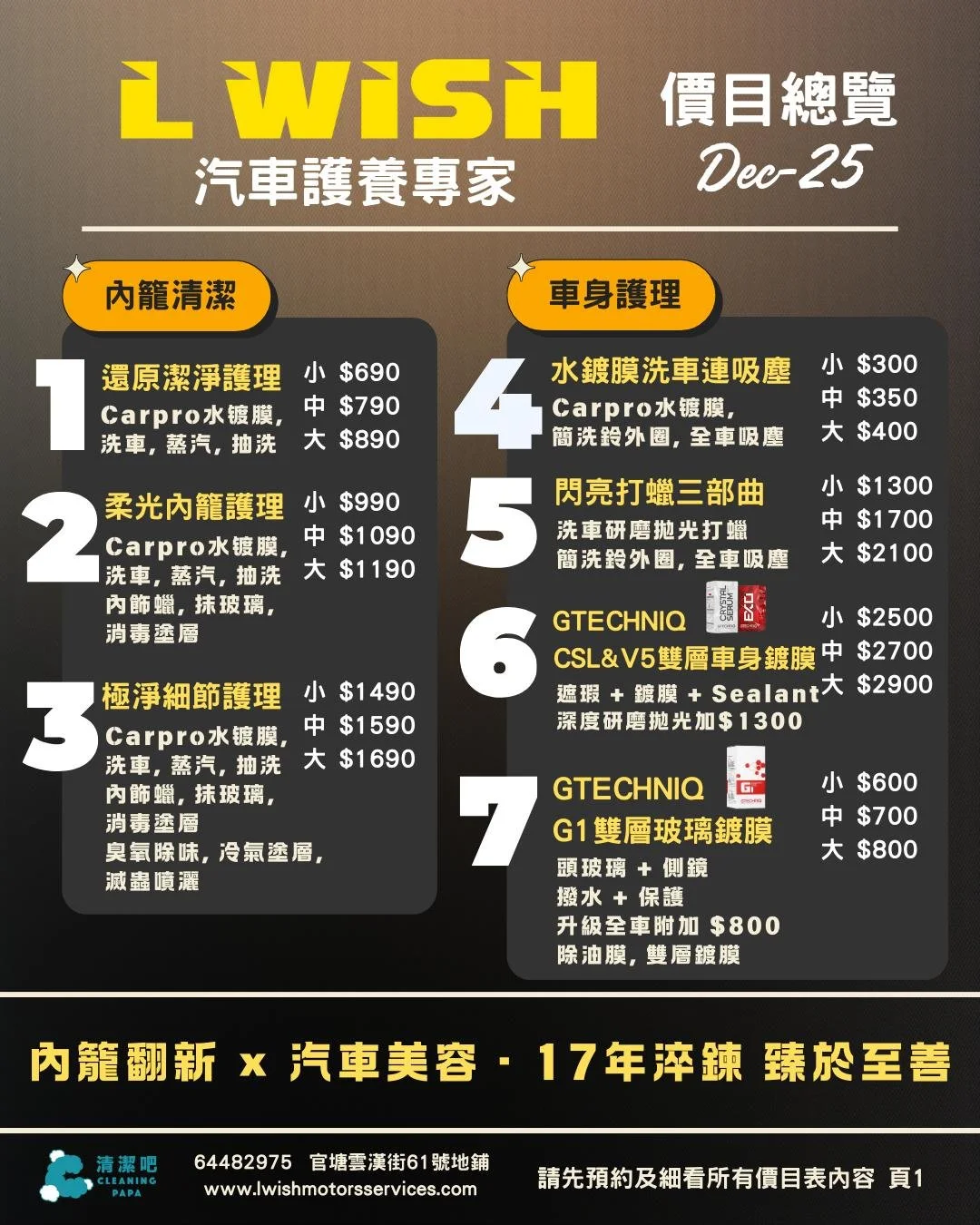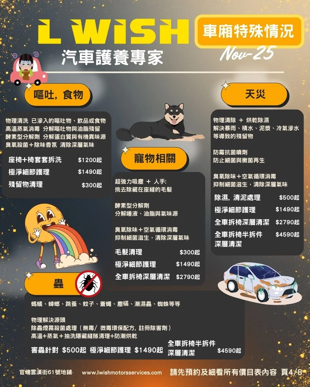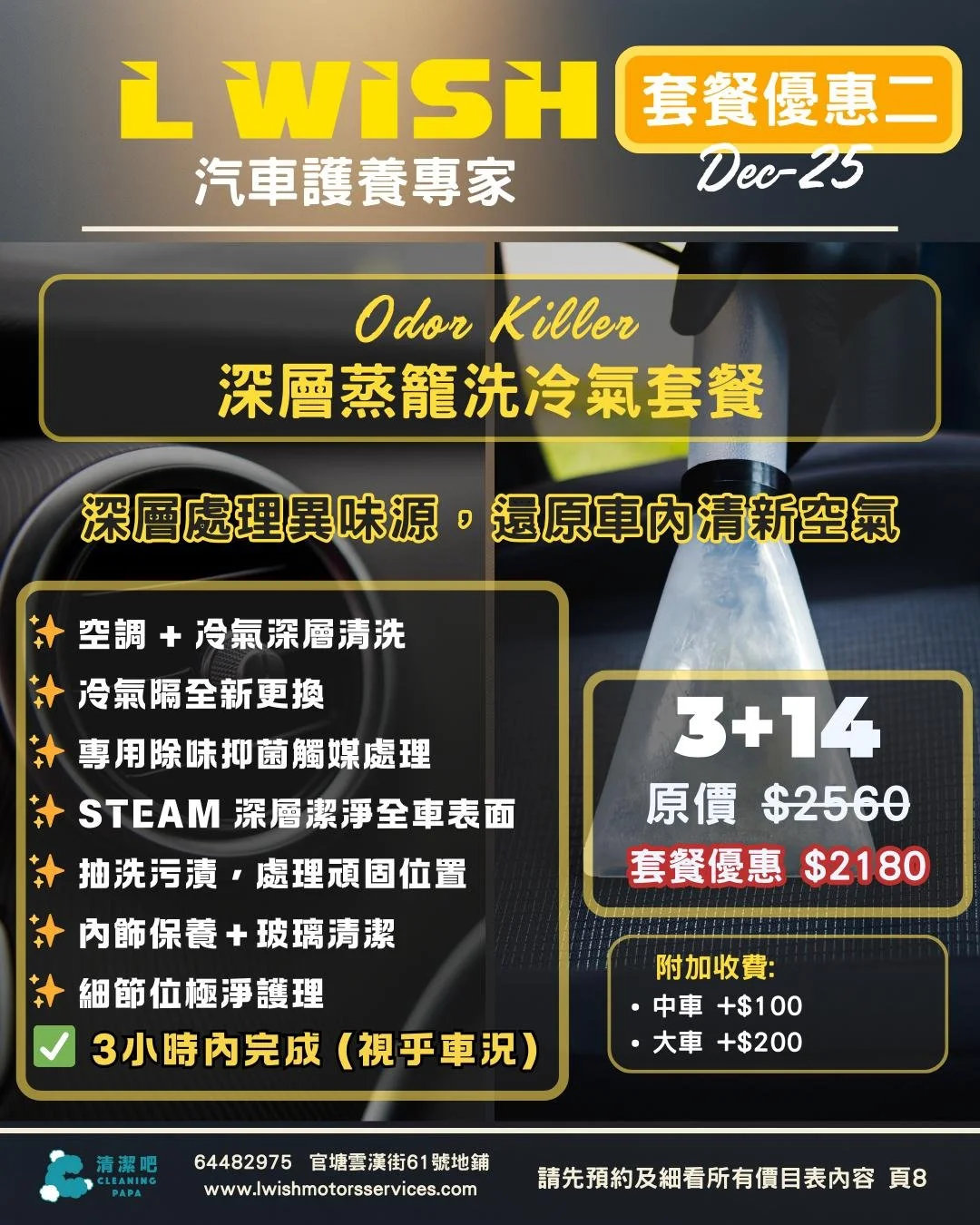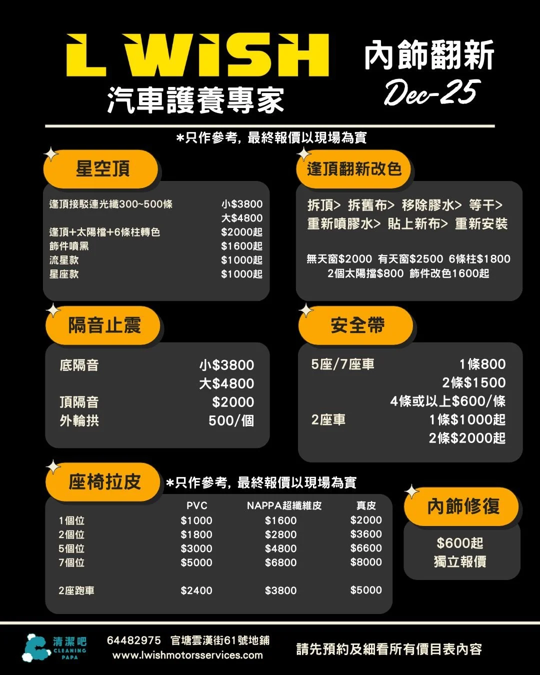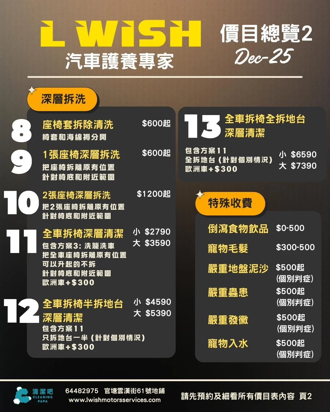 我們為客人提供不同的車廂深層清潔服務套餐,車廂清潔價錢收費由港幣 $368 起。假如客人在服務套餐內容上有額外要求,可以聯絡我們的職員去報價。另外,需注意假如車廂內體積較一般車輛大,車廂清潔價錢可能會因應提高。