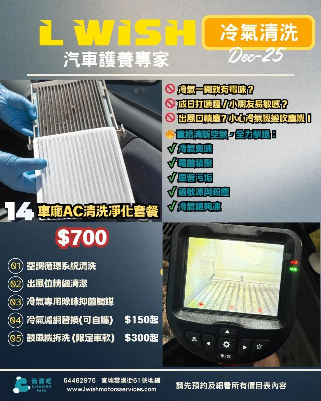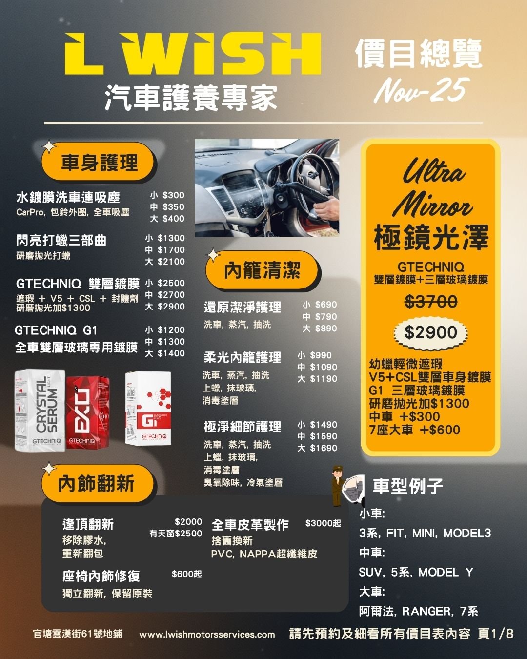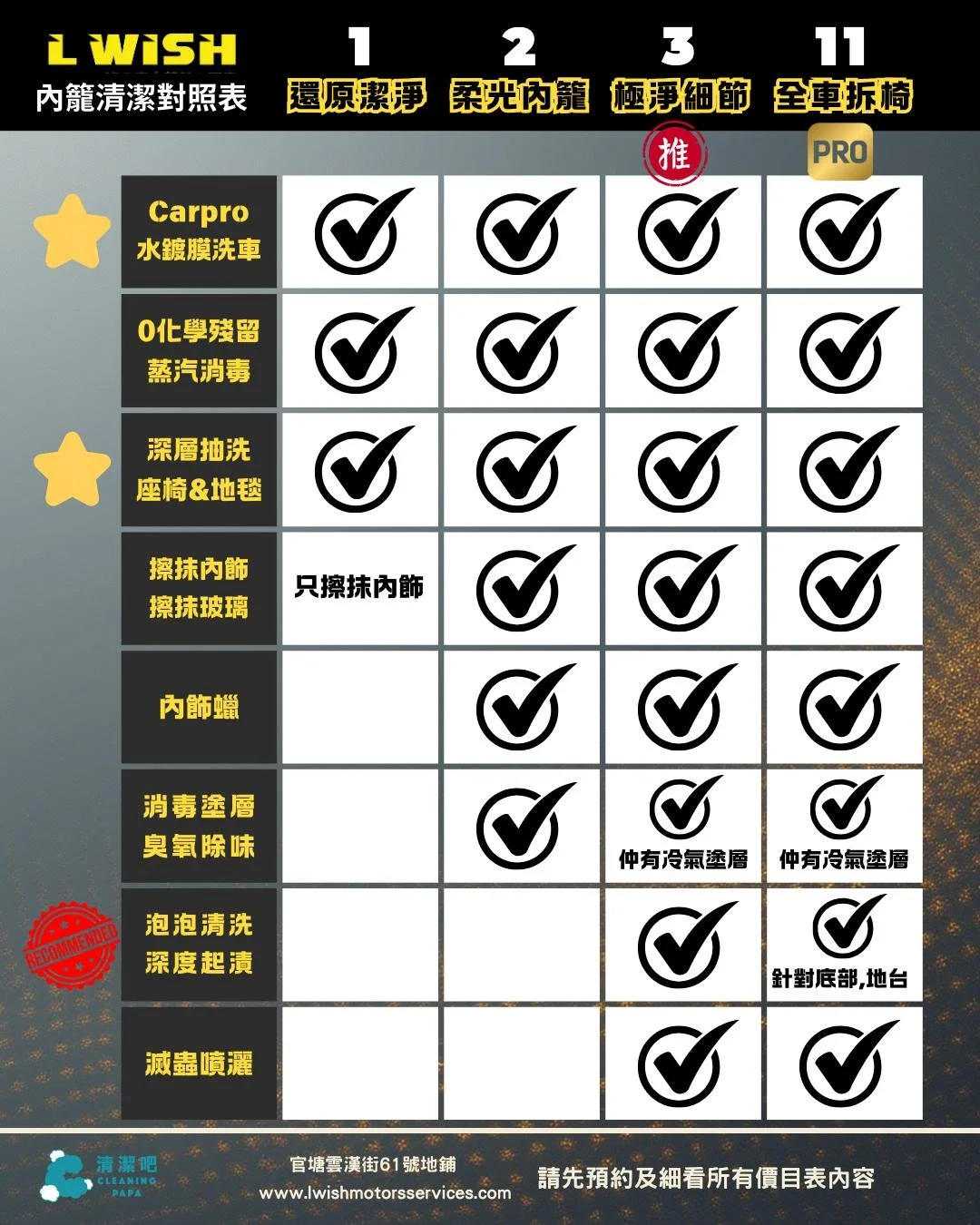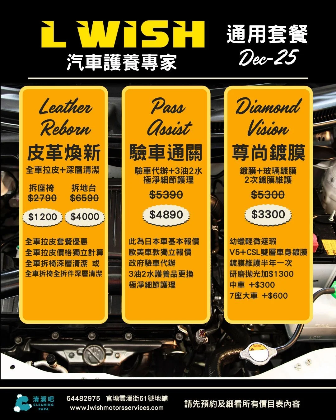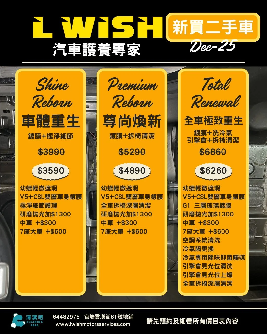 我們為客人提供不同的車廂深層清潔服務套餐,車廂清潔價錢收費由港幣 $368 起。假如客人在服務套餐內容上有額外要求,可以聯絡我們的職員去報價。另外,需注意假如車廂內體積較一般車輛大,車廂清潔價錢可能會因應提高。
