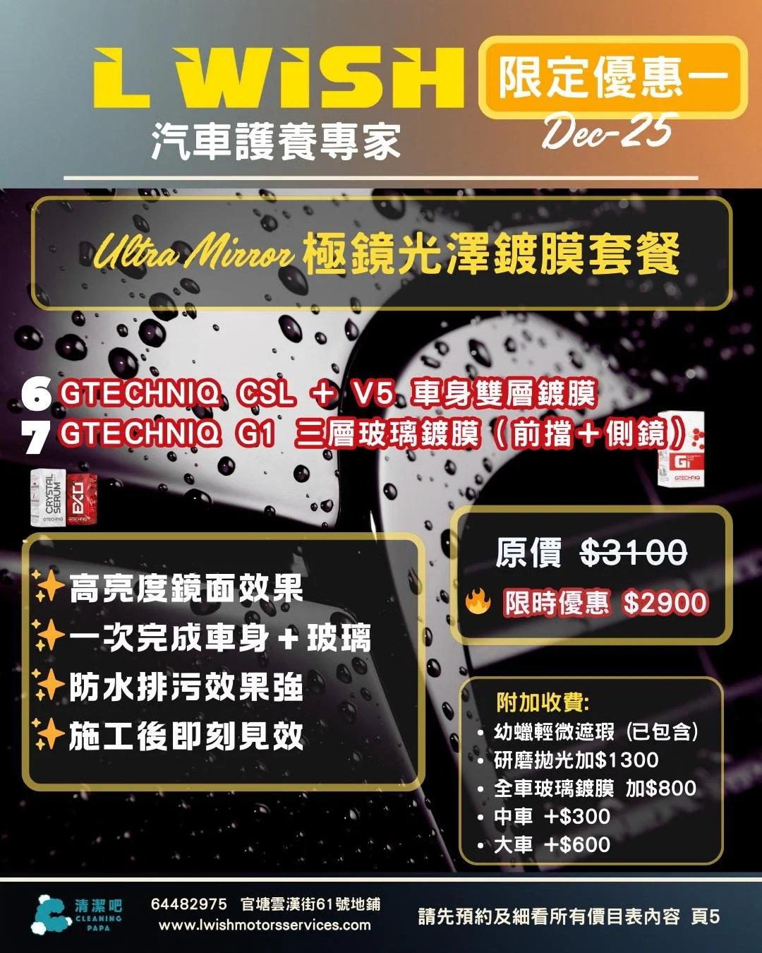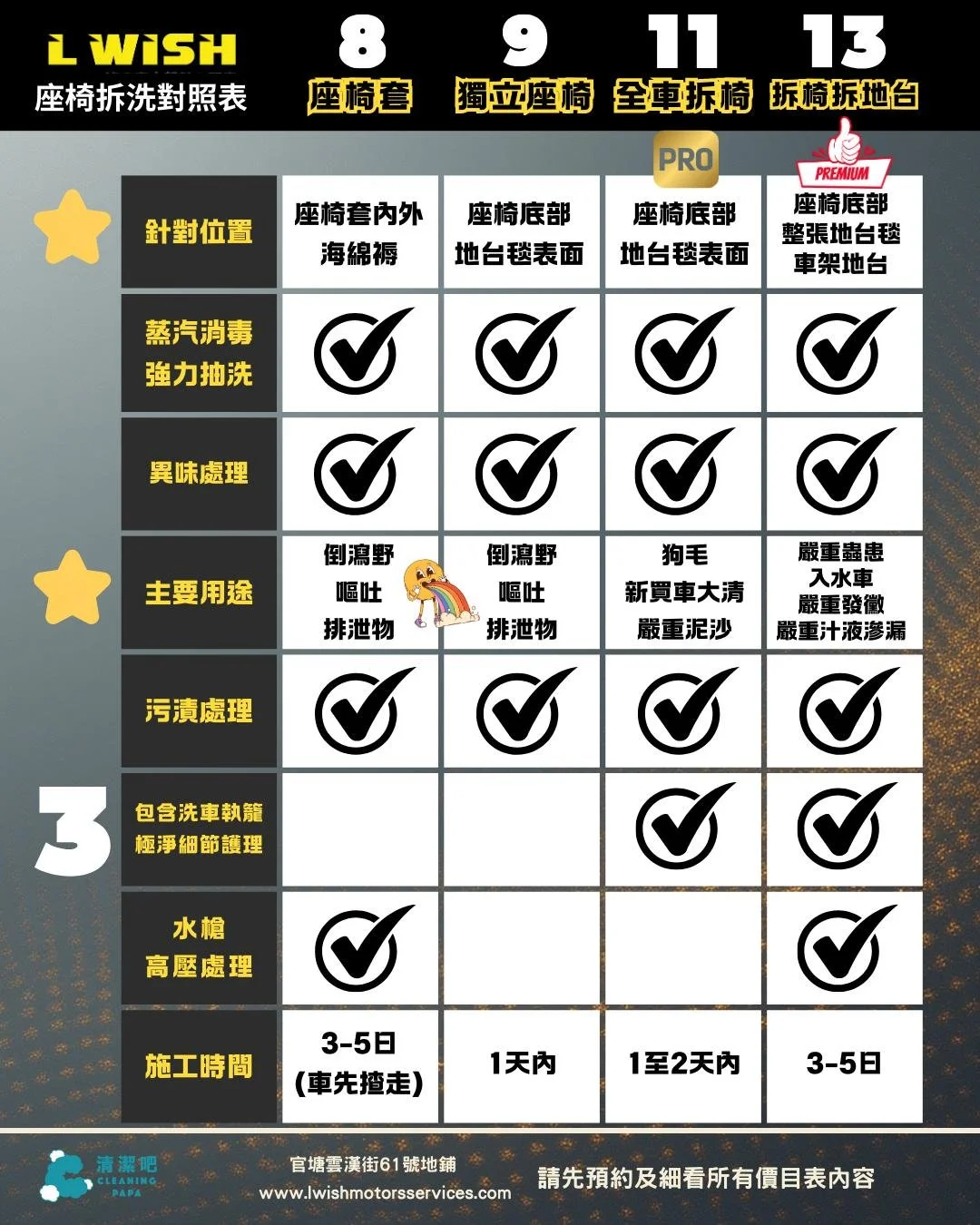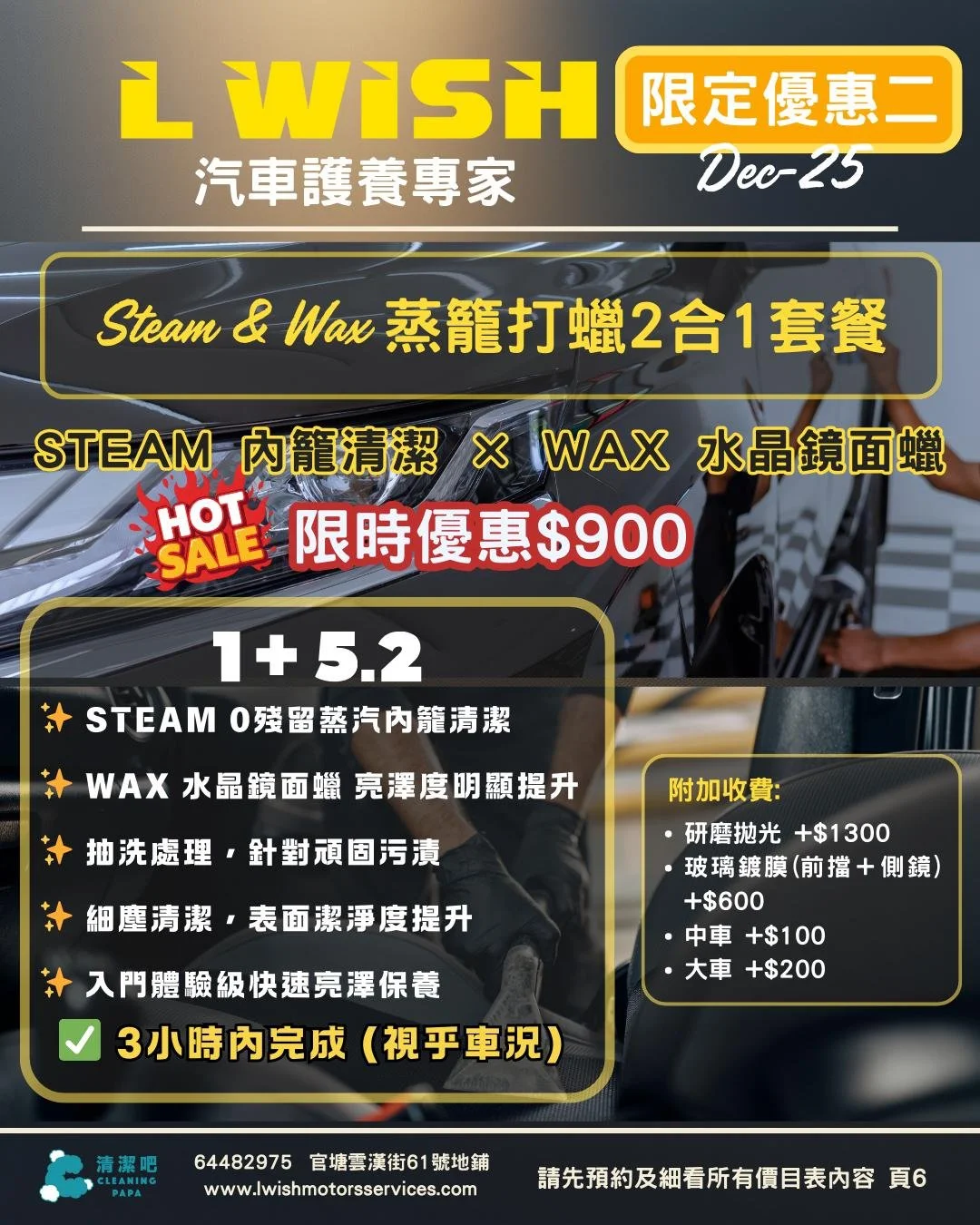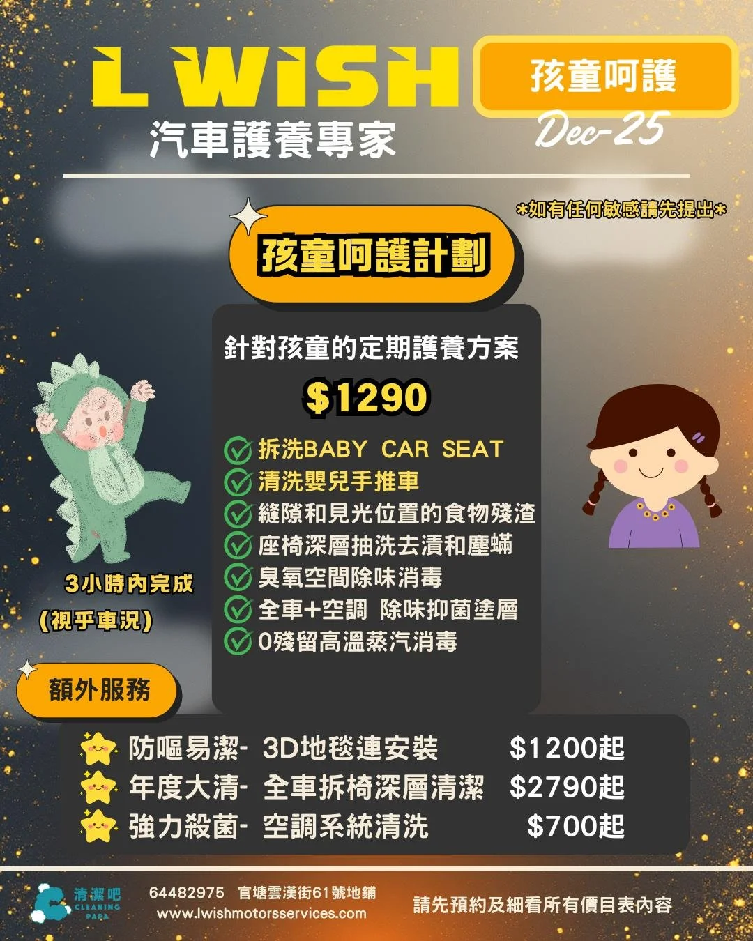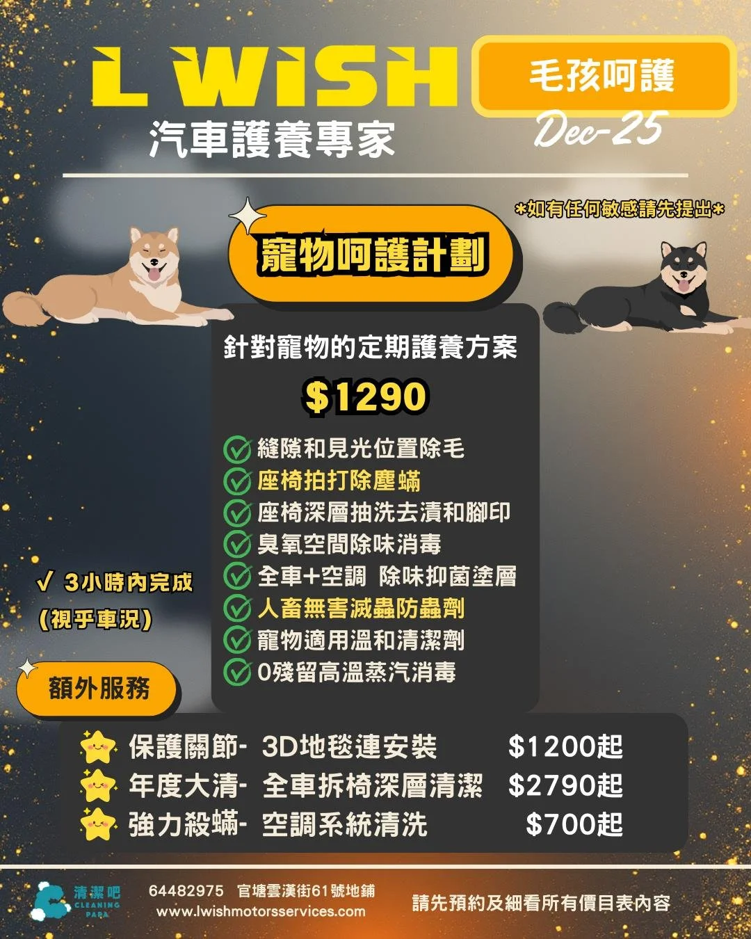 我們為客人提供不同的車廂深層清潔服務套餐,車廂清潔價錢收費由港幣 $368 起。假如客人在服務套餐內容上有額外要求,可以聯絡我們的職員去報價。另外,需注意假如車廂內體積較一般車輛大,車廂清潔價錢可能會因應提高。