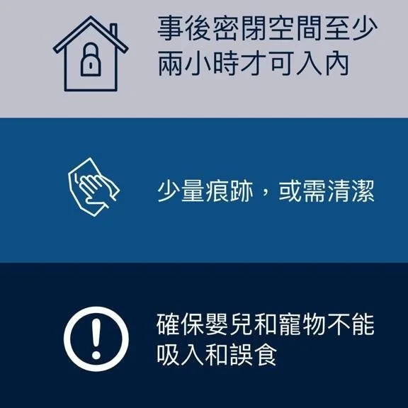 可滅的害蟲包括:木蝨、蟑螂、壁蝨、塵蟎、蚊子、烏蠅、螞蟻、跳蝨、潮濕蟲、小型飛蟲等等。(一次性)